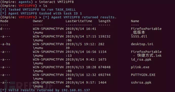 6) 通过interact命令则可以使用以建立的控制信道控制受控主机,如通过简单的ls命令测试成功如下图:
