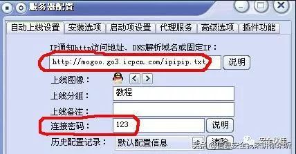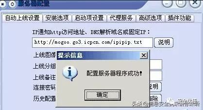 下来点配置服务程序,先点自动上线设置,IP通知那里添上你FTP在HTTP的访问地址加上你放IP文件的地址