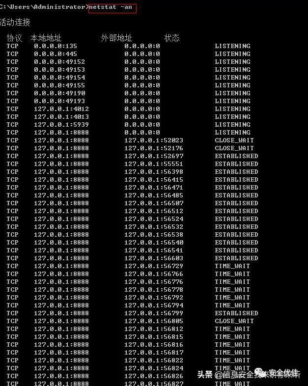 具体的步骤是点击"开始" "运行" "cmd",然后输入netstat -an这个命令能看到所有和自己电脑建立连接的IP以及自己电脑侦听的端口,它包含四个部分——proto(连接方式)、local address(本地连接地址)、foreign address(和本地建立连接的地址)、state(当前端口状态)。通过这个命令的详细信息,我们就可以完全监控电脑的网络连接情况。