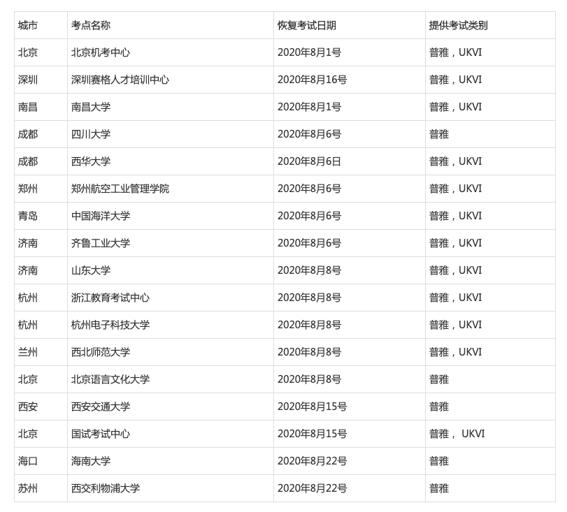 此外,GRE考试在7月已恢复的考点基础上,自8月21日起新增6个复考考点,包括山东科技职业学院(潍坊)、北京外交人员服务局、西安交通大学、国试考试中心(北京)、山东大学、西交利物浦大学等。