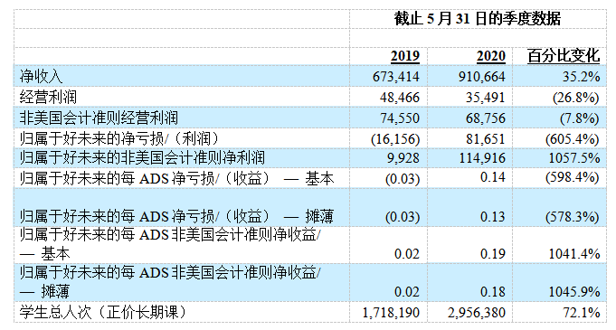 7月30日,好未来公布了2021财年第一季度未经审计财务报告。报告显示,公司净收入从上年同期的6.734亿美元增长到本季的9.107亿美元,同比增幅为35.2%;净利润为8170万美元,上年同期净亏损为1620万美元。