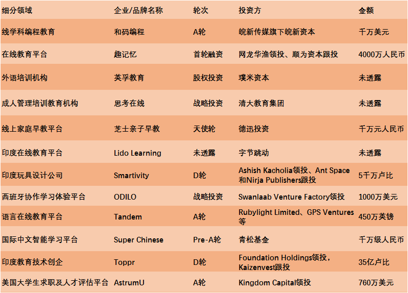 本周资本动态活跃,英孚教育引入璞米资本重大投资;字节跳动正在与印度在线教育平台Lido Learning就投资进行谈判;和码编程完成千万美元级A轮融资......