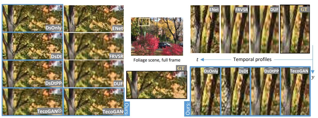 图 6:树叶场景对比。对抗模型(ENet、DsOnly、DsDt、DsDtPP、和 TecoGAN)比使用 L_2 损失训练的方法(FRVSR 和 DUF)具备更好的视觉效果。右图「temporal profiles」中,DsDt、DsDtPP 和 TecoGAN 在时间连续性上显著优于 ENet 和 DsOnly。本文提出的判别器网络的时间信息成功抑制了这些伪影。
