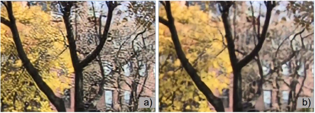 图 4:a)不使用 PP 损失训练出的结果。b)使用 PP 损失训练出的结果。后者成功移除了漂移伪影(drifting artifact)。