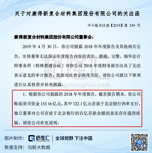 这份关注函中明确提到,康得新账上153亿现金中,有122.1亿元存放于北京银行西单支行。