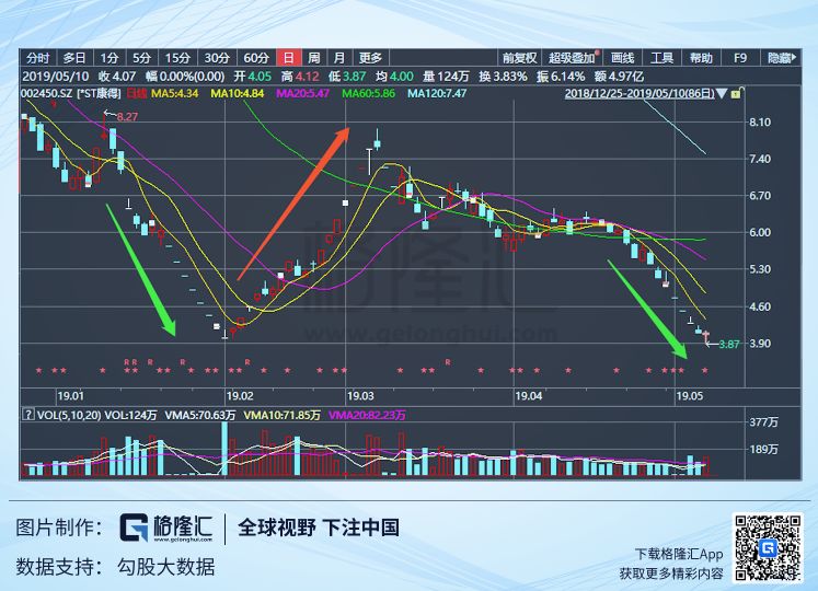4月下旬开始,政策与监管转严,ST康得开始持续下跌。到5月10日,ST康得盘中下探3.87元,收盘价4.07元,炒作结束。