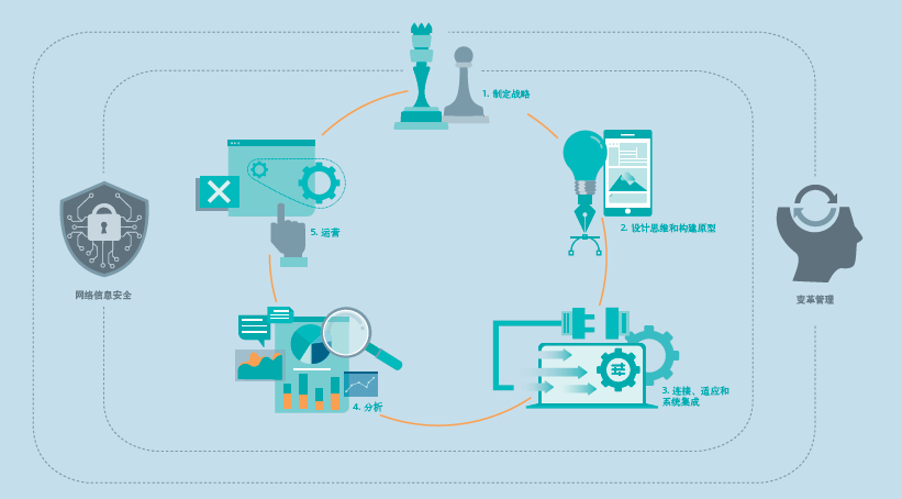 就像西门子在白皮书《物联网变为现实》中画的这幅图。图片中的最外圈,是变革管理,体现了领导者的信心和意志是首要前提。