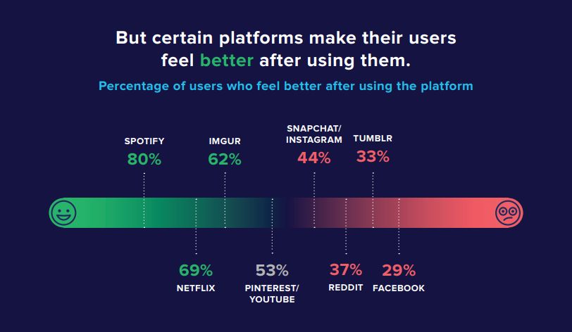 Imgur的匿名性促成了它的成功,在Instagram、Facebook等社区,用户会尝试塑造完美形象,而匿名社区Imgur和Reddit中才会出现真实的自己。据调查,多数用户希望查看自己关注而非算法推荐的内容,也希望使用的社区更加真实,以内容为驱动,62% Imgur用户会在使用过后感觉更开心,该比例仅次于Spotify和Netflix,而Snapchat、Facebook等社交软件则让人越用越不爽。