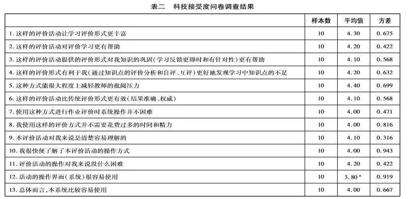 批阅工具开发完成并经过试用、改进后,研究者建立了一个批阅活动“PPT的使用”,并邀请北京师范大学现代教育技术研究所成员进行了二次实验,通过改进的科技接受度问卷(5点量表)进行该批阅工具的科技接受度分析,其中16题测试的是认知有用性,7—13题测试的是认知易用性。笔者在试用中通过SPSS20.0对问卷的信效度进行了分析,认知有用性维度的Cronbache’s Alpha=0.883,认知易用性的Cronbache’s Alpha=0.825,说明问卷的信效度较好。
