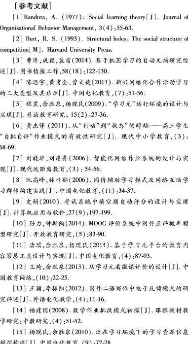 从理论的角度看,联通主义学习理论、社会化学习理论、网络化合作活动学习理论都为作业社会化批阅实践提供了支持,而作业的社会化批阅同样发展了这些理论。联通主义强调学习是将不同的信息源和节点连接并形成交互网络的过程,学习者习得的知识不再是固化的,而是在交互网络中不断流通和主动建构得到的知识流(唐瑶等,2014)。作业社会化批阅将学科专家、教师、学生、家长连成评价网络,以学生知识评价为网络中的信息流,在网络节点与信息流的交互下促进学习者对知识的整体性理解、掌握和迁移。社会化学习理论重视交互决定论和观察学习,即学习者通过观察其他个体的行为并通过其强化结果反馈而习得新行为或对已有行为进行矫正(Bandura,1977)。网络化合作活动学习理论强调通过学习平台提供的学习活动建立师生交互、生生交互的合作关系,从而促进知识有意义建构和学习效果的有效提高(Burt,1993;陈思宇等,2013)。作业社会化批阅拓展了社会化学习,使学习者通过网络化交互批阅和反馈促进自身知识的掌握。另一方面,作业社会化批阅也拓展了网络化合作活动学习理论的应用空间和社交网络,借助网络学习平台和社会化的用户群,作业批阅从学生和教师的双向交互延伸为基于社交网络的社会化学习活动,这样更有利于学习的发展和社会化学习共同体的建立,从而提高作业批阅的权威性。
