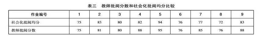 研究者通过两种方式进行系统的一致性验证:一种通过SPSS20.0的Spearman检验进行分析,另一种基于批阅允许误差临界值对批阅差异值(教师批阅分数和社会化批阅均分的差)进行一致性比较(如果差异值超过临界误差,那么该作业批阅结果不一致)。Spearman相关检验结果显示,相关一致性值为0.857,显著性为0.003(见表四)。这说明,教师批阅结果和社会化批阅均分存在一致性相关。从差异值来看,9份作业中,5份作业差值小于临界误差3分,一致程度为56%,其他4份作业的差异值在5分以内,说明社会化批阅工具在一定程度上能保证批阅的一致性。从上述两种方法的分析结果看,作业社会化批阅工具的批阅一致性效度较好,可以在减轻教师压力的基础上保障批阅的权威性,为促进学习者的作业评价和系统的大规模应用提供了契机。