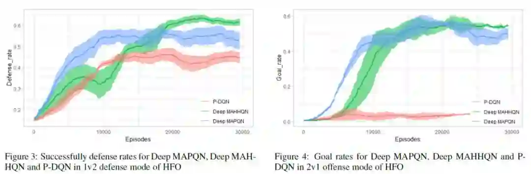 可以看到在两种模式中,Deep MAPQN 和 Deep MAHHQN 相比于 P-DQN 均得到了更好的训练结果(进球率和防守成功率)。另一方面,后者的训练结果表现更优于前者,这说明我们对 Deep MAHHQN 集中训练部分的改进在一定程度上加深了不同智能体之间的交流,提高了算法稳定性。进一步观察习得的策略,可以发现 Deep MAPQN 和 Deep MAHHQN 所训练的两名球员能够在比赛开始时就自动分工(比如在防守时,一方负责守门,一方负责抢球),以取得更好的防守效果。