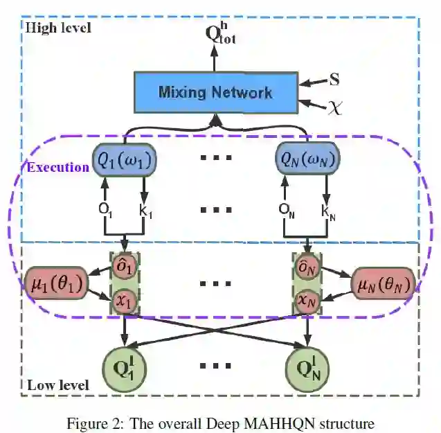 该方法的提出受实际中人的决策过程启发:人往往先决定做什么,再决定怎么做,或做到什么程度。于是 Deep MAHHQN 借鉴了分层学习的思想,通过两层网络分别输出混合动作中的离散部分和连续动作参数,得到最优的混合动作组。Deep MAHHQN 依然遵循了集中训练,分散学习的结构,在训练过程中上下层通过不同的 Q 网络来考虑所有智能体的总体动作的效益,并进行策略更新。