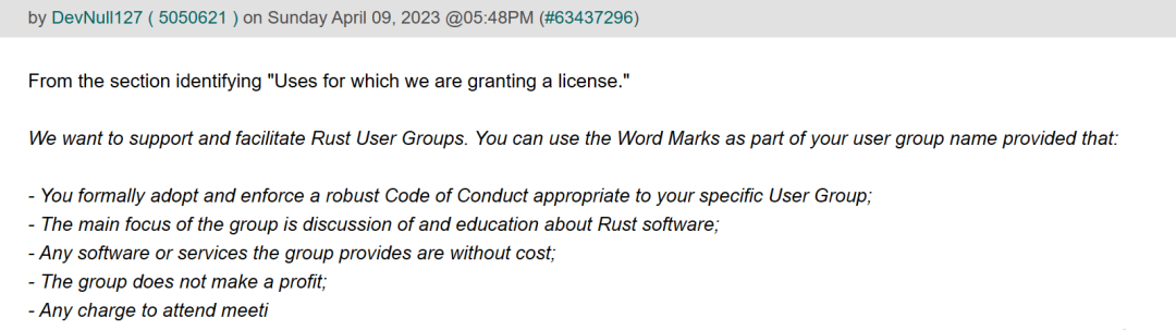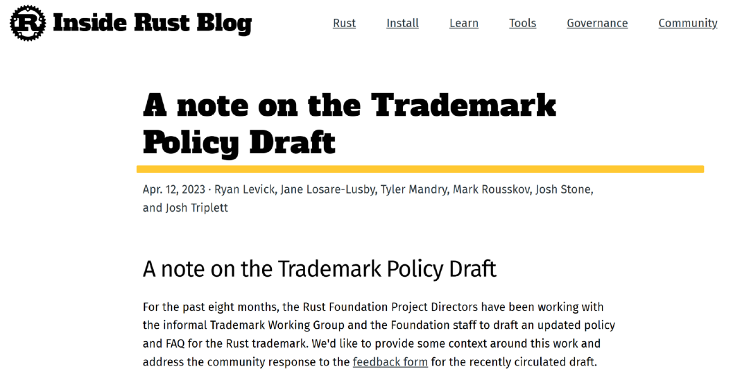 从 2022 年 8 月的商标政策审查调查开始, Rust 基金会一直在致力于修订商标政策。在今年 2 月的董事会会议记录中记录了:“董事会审查了商标政策的最终草案,并认为它将被大众接受。” 尽管其中一个条款表示,在 Rust 语言编写的软件程序使用商标将构成侵权“似乎过于严格”,需要向法律顾问寻求澄清。