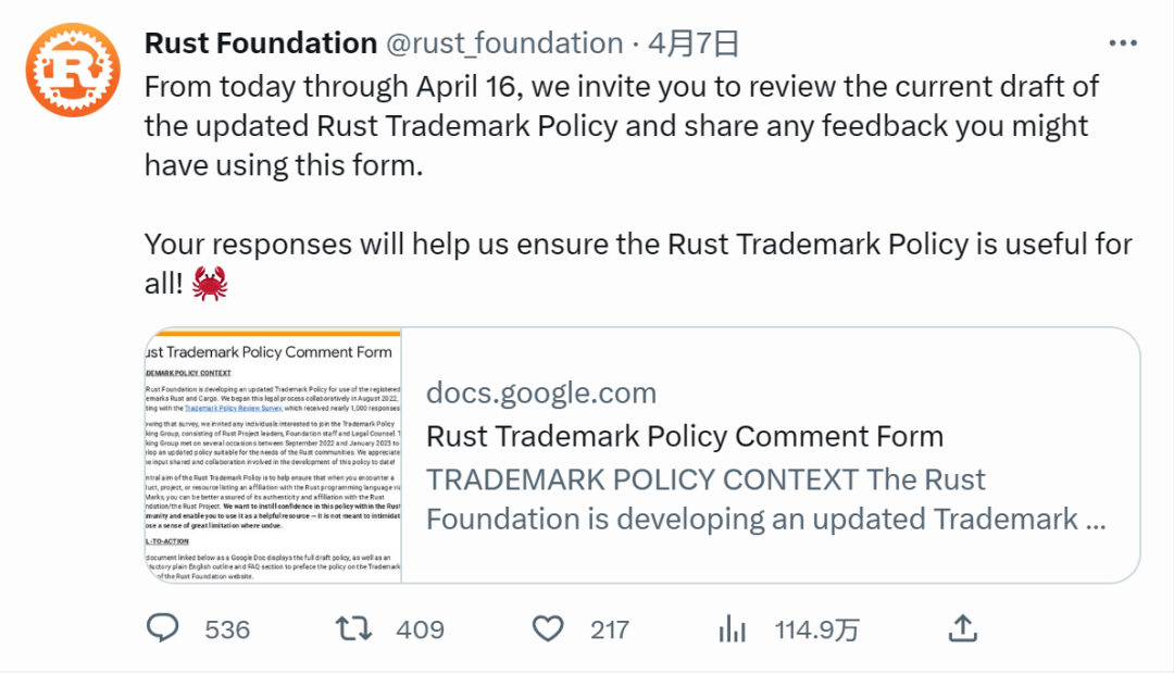对于新草案引发的负面争议,基金会在 Twitter 上表示:“ Rust 基金会团队正在接收所有意见和反馈,并将在 4 月 17 日星期一(表单关闭后的第二天)提供下一步更新方案。”