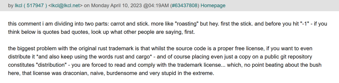 当然,也有网友表示,“原始 Rust 商标的最大问题是,虽然源代码是一个适当的自由许可证,但如果你想分发它并且继续使用 Rust 和 cargo 这两个词,即使只是将一个副本放在公共 git 存储库上也构成了“分发”。你必须阅读并遵守商标许可证,而这个许可证无需绕弯子地说,是严苛的、幼稚的、繁琐的,极其愚蠢的。“