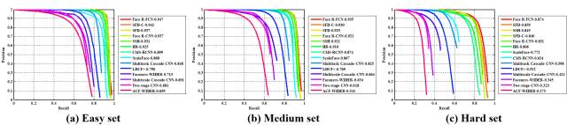 WIDER FACE评测结果曲线,第一行是验证集结果,第二行是测试集结果。详情见如下链接:
