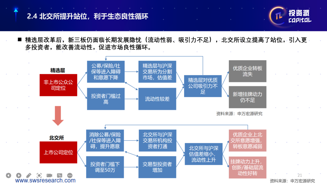 这个正向循环的出发点在于,北交所的公司的流动性得到了增强,以及它不再会针对沪深交易所产生更多的折价,那么就会有更多的公司愿意上市到北交所来,从而形成公司质量的提升,以及投资者关注度的提升。