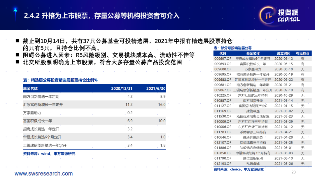 最高等级意味着什么呢?意味着很多基民其实是买不了这些基金的。一方面,对于存量的老基金,如果要开通精选层的投资范围,它的风险等级会被随之提高,因此大量的存量公募不太能够把范围扩展到投资精选层来。另一方面,大量的新设立的基金为了省去麻烦,以及不希望把发售的整个规模缩小,也不会去投精选层。所以,在精选层运行一年之后,我们发现整个市场可能只有10来个公募基金产品真正去投了这个市场。