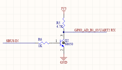 由于SBUS信号是一个反向电平的串口信号,这里使用一个三级管搭了一个简单的反向电路,从而将信号正确到接入到处理器的串口输入端。