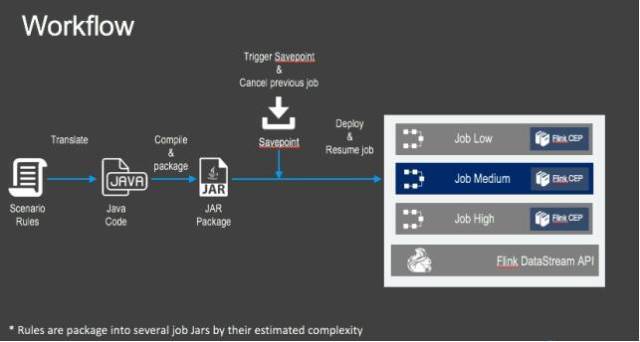用户利用我们定义的语言编写场景规则,此后我们将这些规则翻译为 Java 代码。接下来,我们对代码进行编译并打包为 jar 文件。最后,我们触发保存点并撤销当前正在运行的作业,部署新规则 jar 而后恢复该作业。