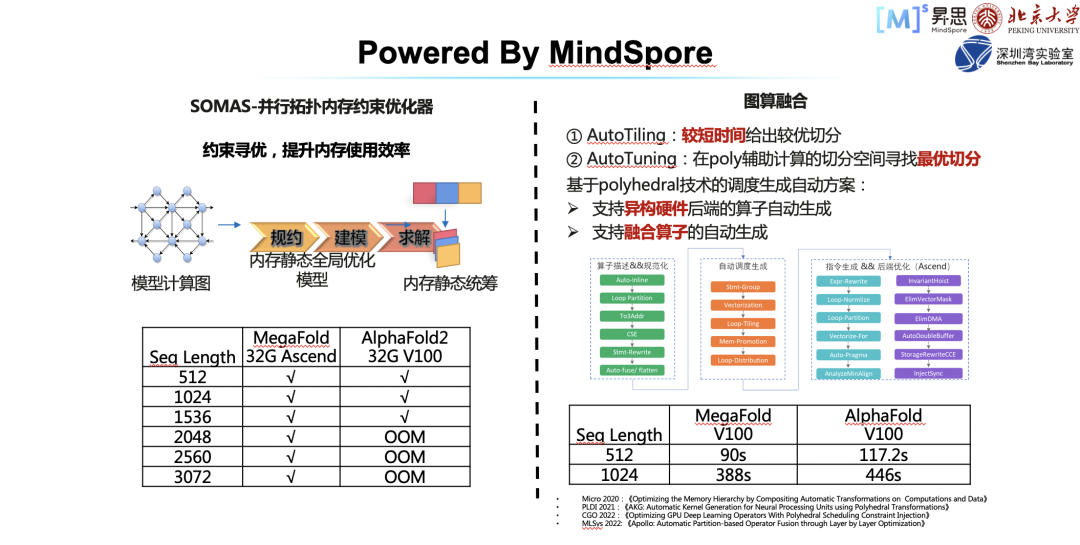 软件层面的问题主要为算法的内存消耗,算法占用的显存与序列长度是立方关系,如果基础软件内存优化做得不好,很容易导致显存爆炸。同时,推理时性能主要消耗在共进化信息检索。