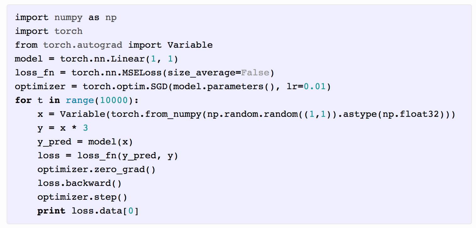 虽然Pytorch例子少一行代码,但操作起来却要明晰得多,而且在下面这个训练循环(training loop)里面,语法遵循实际学习过程要严谨得多。