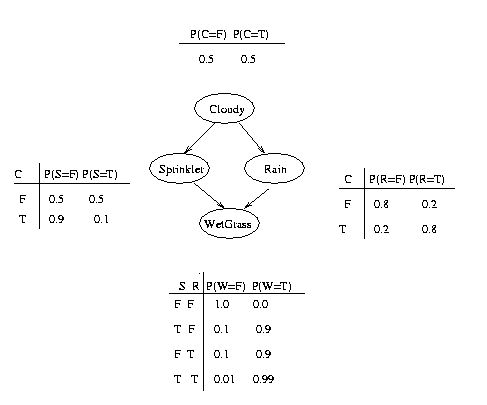 下面我们通过一个栗子更好地了解有向图。“草地是湿的(grass is wet)"的原因可能有两个:洒水器打开(S=true)或下雨(R=true)。它们之间的关系可以用一个条件概率表(conditional probability table, CPT) 来描述。比如说,我们可以看到 P(W=true|S=true,R=true)=0.99,即当洒水器打开同时下雨的条件下,“草地湿的”概率为0.99。而“洒水器”和“下雨”的状态又是由“天气”决定的。所以,整体的联合概率可以写成: