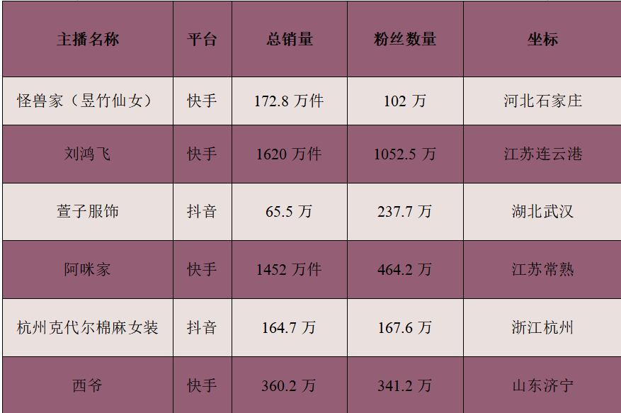 从主播坐标来看,似乎没有十分明显的特征,全国各地均有分布,但有明显靠近工厂或者集散地的趋势。以上分享的 6 个主播中五个都表示有自建工厂或者合作工厂,既可以解释低价又容易建立起姐姐们的信任。