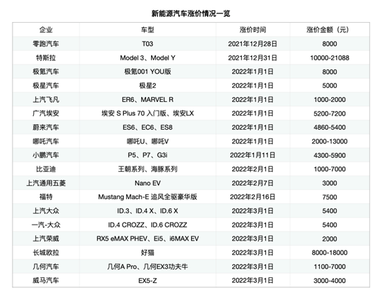 在此之前,小鹏汽车、比亚迪、上汽通用五菱、上汽大众以及一汽-大众在内的车企均先后宣布涨价,国内的主流新能源车企基本都迈入了“价格普涨期”。