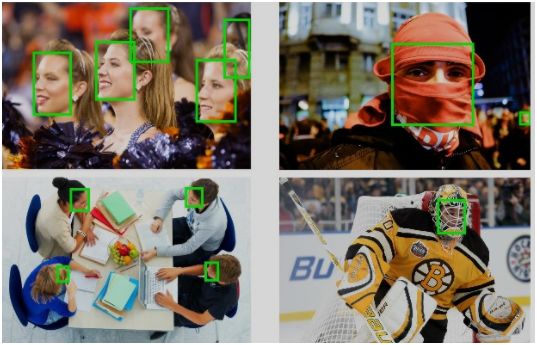 人脸检测:就是给定任意一张图片,找到其中是否存在一个或多个人脸,并返回图片中 每个人脸的位置、范围及特征等。如下图: