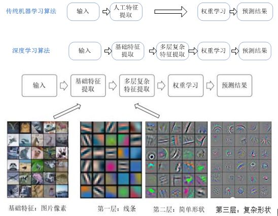 特征提取:就是将人脸图像信息数字化,把人脸图像转换为一串数字。特征提取是一项重要内容,传统机器学习这部分往往要占据大部分时间和精力,有时虽然花去了时间,效果却不一定理想,好在深度学习很多都是自动获取特征,下图为传统机器学习与深度学习的一些异同,尤其是在提取特征方面。