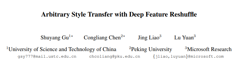 推荐理由:本文提出了一种基于深层特征重排列的方法来进行任意图像风格迁移的任务。在理论和实验上都证明了我们的方法可以同时满足整体特征迁移和局部风格迁移的约束。