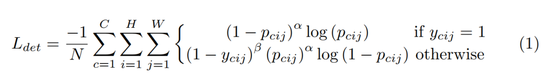 pcij表示类别为c,坐标是(i,j)的预测热点图,ycij表示相应位置的ground-truth,论文提出变体Focal loss表示检测目标的损失函数: