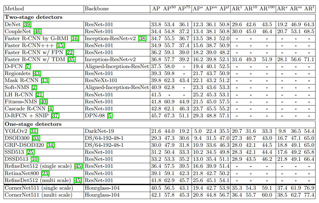 CornerNet相比其它one-stage目标检测算法,MS COCO数据集测试AP有明显提高,虽然性能接近于Two-stage检测算法,但是推断时间无明显优势。
