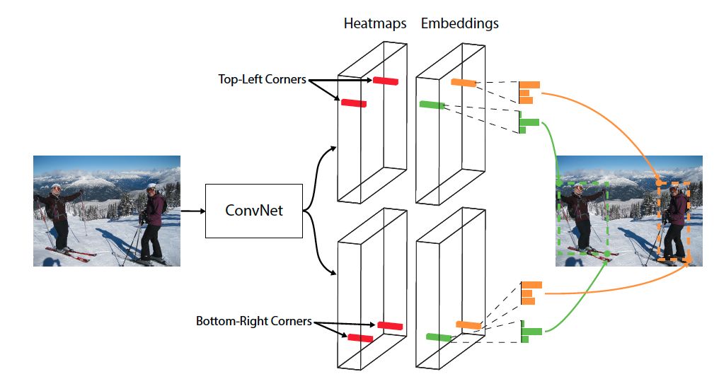 论文的第一个创新是讲目标检测上升到方法论,基于多人姿态估计的Bottom-Up思想,首先同时预测定位框的顶点对(左上角和右下角)热点图和embedding vector,根据embedding vector对顶点进行分组。