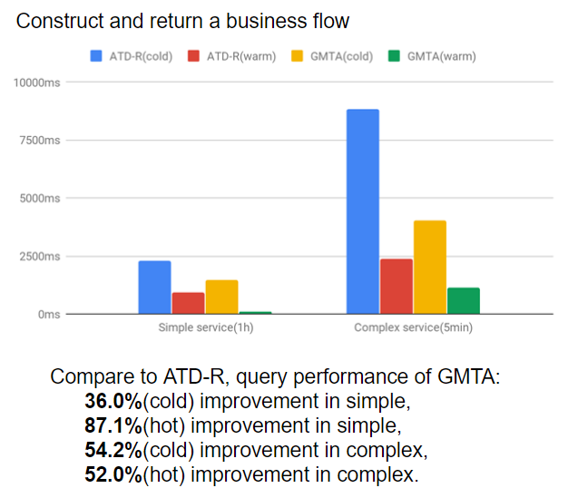下图展示了生成并且返回Business Flow时,ATD-R和GMTA的性能对比,从结果可以看出,不管是简单规则还是复杂规则,冷查询还是热查询,GMTA相较于ATD-R都有着很大的性能提升,这说明了基于图的存储结构对于查询性能的提升有着明显的帮助。