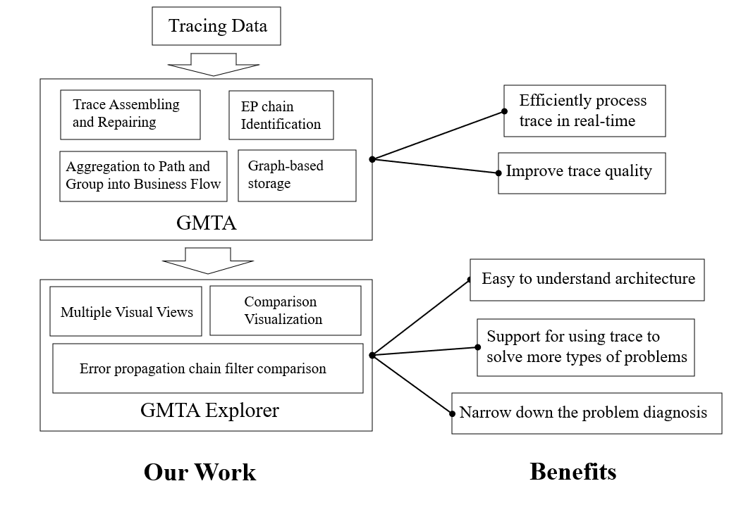 为了解决这些问题,我们提出了GMTA和GMTA Explorer。GMTA采用基于图的思想对Trace数据进行聚合、处理和存储,提供高效的查询接口。GMTA Explorer在GMTA基础上提供了基本可视化视图、对比视图和错误链筛选视图等,难以理解业务、单个trace视图无用和难以定位根因范围等问题。