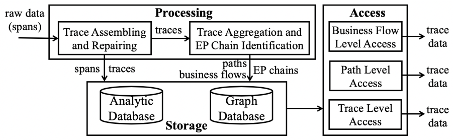 下图展示了GMTA的架构图,GMTA一共分为三个模块:处理模块(Processing)、存储模块(Storage)和访问模块(Access)。Trace数据在处理模块经过聚合和筛选,会被存储至存储模块。其中span数据会被存储到分析型数据库,聚合结果会被存储到图数据库中,访问层结合两种数据库对外提供多层次的高效的查询接口。