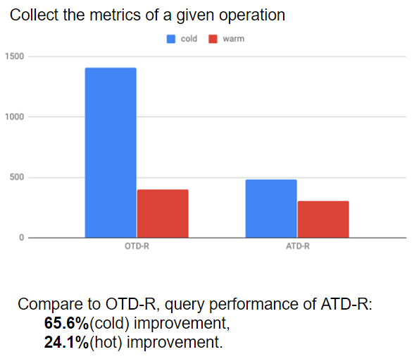 下图展示了根据指定Operation查询聚合Metrics的场景时,OTD-R和ATD-R的性能对比,因为我们使用的分析型数据库和图数据库都有热数据缓存的功能,所以查询性能按照冷和热分别展示。可以看出,ATD-R相较于OTD-R在冷查询时有65.6%的性能提升,在热查询时有24.1的性能提升。这说明聚合Path可以提升部分场景的查询性能。
