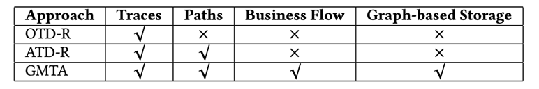 针对GMTA,我们设置了如下表所示的三个实验系统用于对比,其中OTD-R是常见的分布式追踪系统采用的方案:只支持最简单的Trace级别的查询; ATD-R是之前eBay实现的方案:把Trace聚合成了Path,但是没有采用基于图的存储,也没有实现Business Flow的筛选; 最后一个系统是我们所实现的GMTA。
