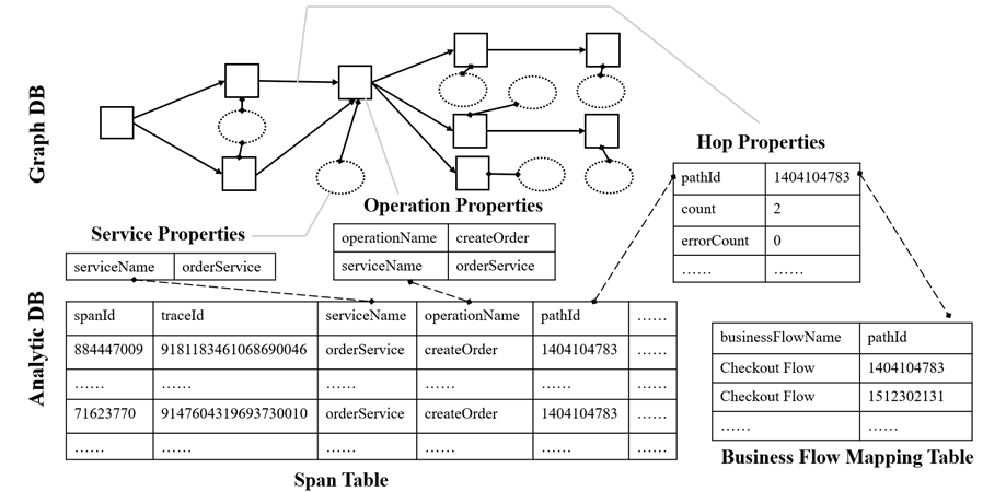 经过聚合处理的span数据被存储在分析型数据库中,聚合得到的Path存储在图数据库中,通过ServiceName, OperationName和Path ID完成两个数据库的关联。已经生成的Business Flow的信息也存储在分析型数据库中,当用户生成新的Business Flow时,会先在图数据库中完成匹配然后把映射关系存储到分析型数据库中。GMTA结合使用两种数据库的优势,可以提供多种聚合级别的数据查询,并且提高查询的效率。