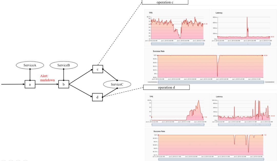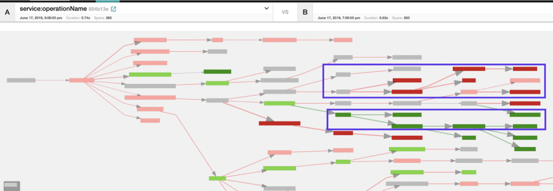 第一个案例是一个开发者负责的业务严重依赖于另一个团队的业务,因此需要了解另一个团队业务的变更是否会影响到自己,他使用GMTA Explorer来对比了两个不同时间段内的Business Flow,从下图中可以明显看出,方框中深红色部分的Operation变更为了深绿方框中的Operation。通过这个视图开发者了解了变更内容,并且通过点击方块查看了更多指标信息,确认了这次变更不会影响到自己的业务,他通过GMTA Explorer省去了和另一个团队交流的成本。