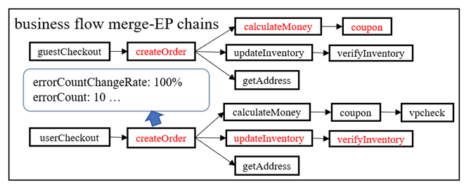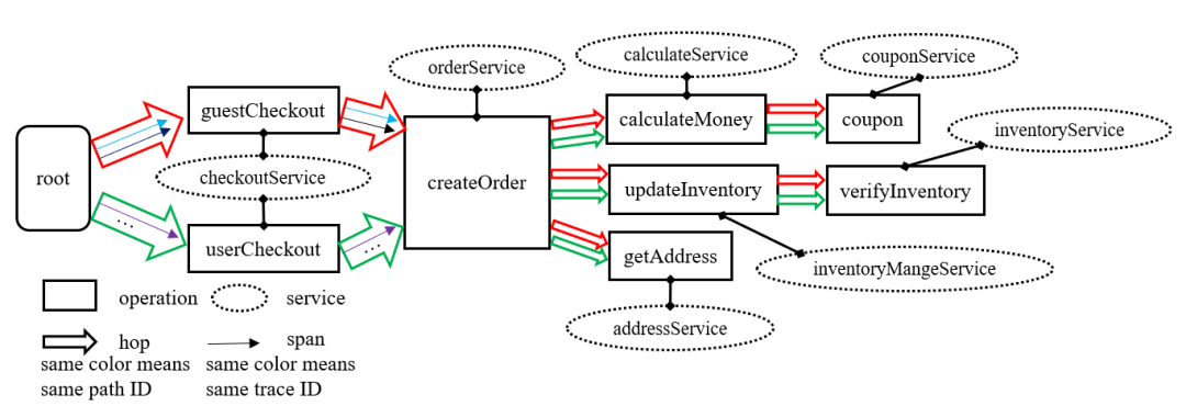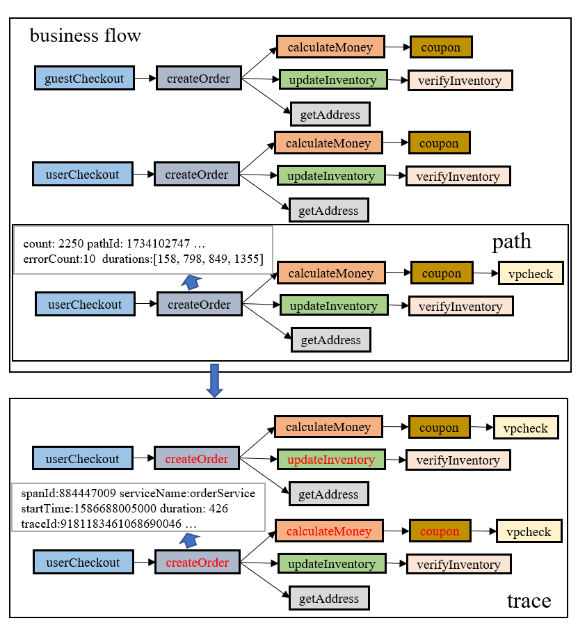 下图中的小箭头代表一个Span,颜色相同的Span代表这些Span有相同的Trace ID,GMTA会先把Trace ID相同的Span拼接为Trace,同时寻找出有错误的Span组成的错误链。然后会把路径完全相同的Trace聚合为一条Path,如图中的蓝色和黑色的两条Trace路径完全相同,被聚合为红色大箭头组成的Path,绿色大箭头组成了另一条Path。两条Path经过的一个Operation不一样。在这个例子中,我们定义的Business Flow筛选规则是经过“createOrder”这个Operation的Path都属于购买场景,所以图中的两条Path被划分为了同一个Business Flow。