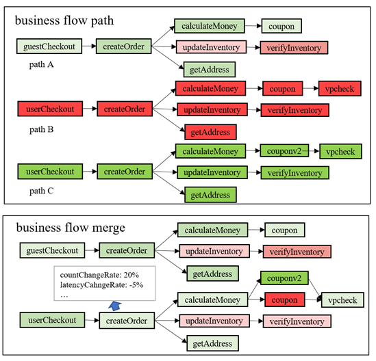 接下来我们来看一看Business Flow的对比视图,在这个图里面方块仍然代表Operation,但是颜色代表平均耗时的变化,红色代表增加,绿色代表降低,颜色越深代表变化幅度越大,从Business Flow的合并视图可以明显地看出,新的时间段相较于前一个时间段Operation “coupon”升级到了“couponV2”。