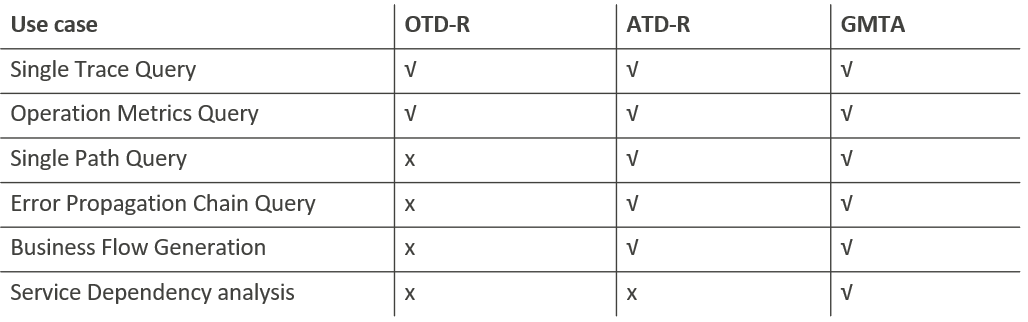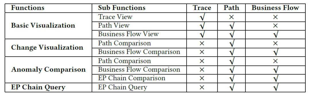 下面这个表格展示了GMTA的四个主要功能以及与查询GMTA的数据的级别的对应关系,前两个功能基本可视化和变更可视化常被用于辅助架构理解,后两个功能异常对比和错误传播链查询常被用于辅助故障诊断。