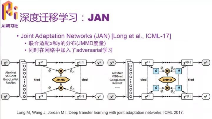 17年的ICML提出了JAN网络,两个核心贡献如下:一是联合适配x和y的分布(JMMD度量),二是在网络中加入了adversarial学习。