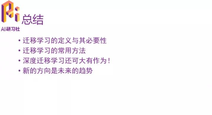 今天主要是希望大家了解到迁移学习,知道迁移学习的常用方法,大概了解到深度迁移学习以及一些最新的方向。