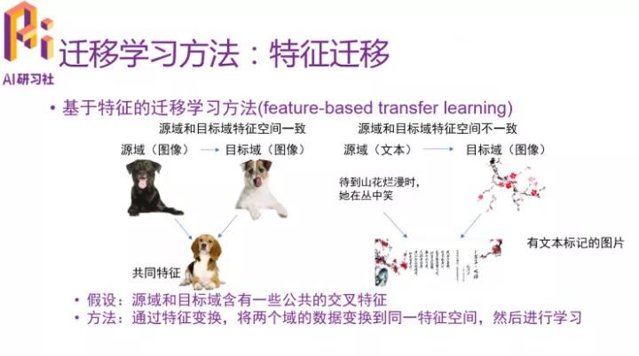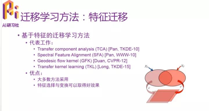 假设是源域和目标域含有一些公共的交叉特征,方法是通过特征变换,将两个域的数据变换到同一特征空间,然后进行学习。