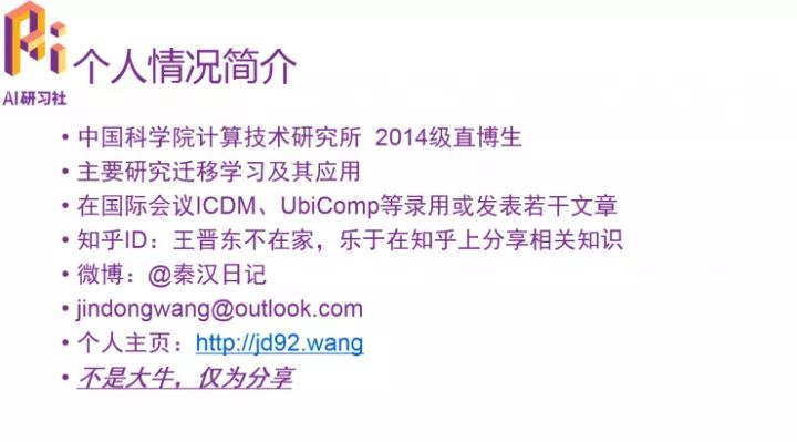 我是中国科学院计算技术研究2014级直博生王晋东,主要研究方向是迁移学习及其应用,下面是我的一些基本资料。今天主要是来分享知识,欢迎大家批评指正。